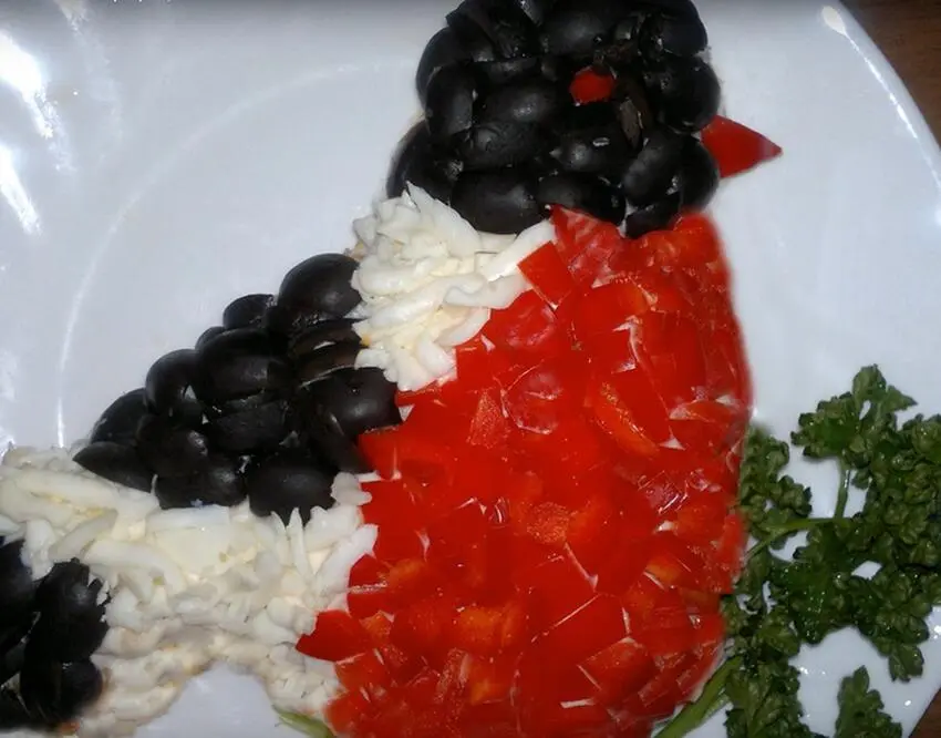Отварить картофель, морковь и яйца. Лук залить кипятком (можно добавить уксус). Овощи натереть, яичный желток и белок измельчить отдельно. Курицу отварить и нарезать кубиками. Ингредиенты выкладываются на блюдо слоями — сначала картофель, который нужно чуть-чуть подсолить, потом — лук, майонез. Далее идет подсоленная курица, майонез, желток, слой тертой моркови, следом — майонез и белок, снова майонез. Последний слой, который станет украшением, нужно сделать из красного перца, белка и маслин. Выкладывать ингредиенты необходимо, повторяя окрас и форму снегиря.