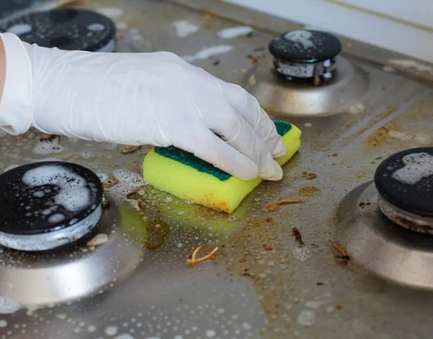 Полученное средство необходимо нанести на поверхность плиты тонким слоем, избегая конфорок. Выждать немного времени и убрать жидкость вместе с загрязнениями обычной тряпкой.